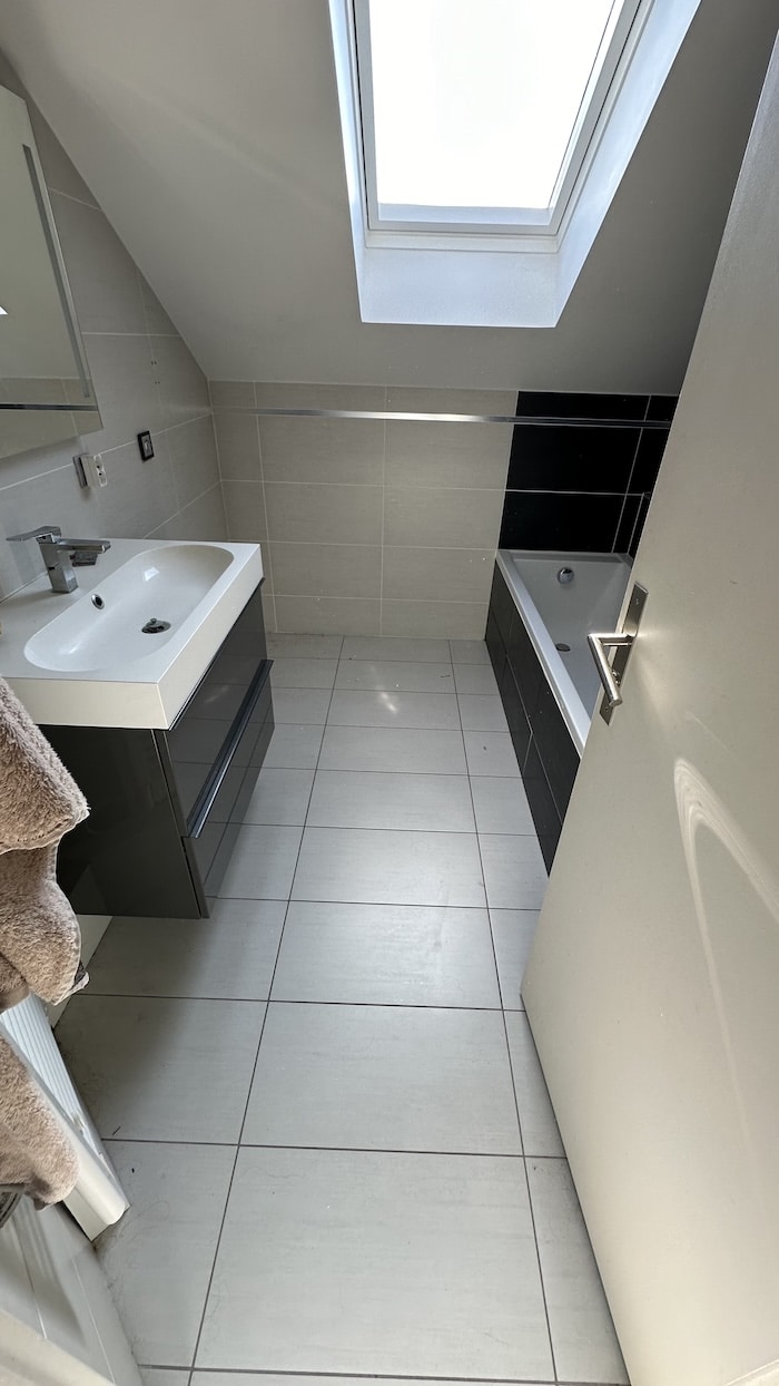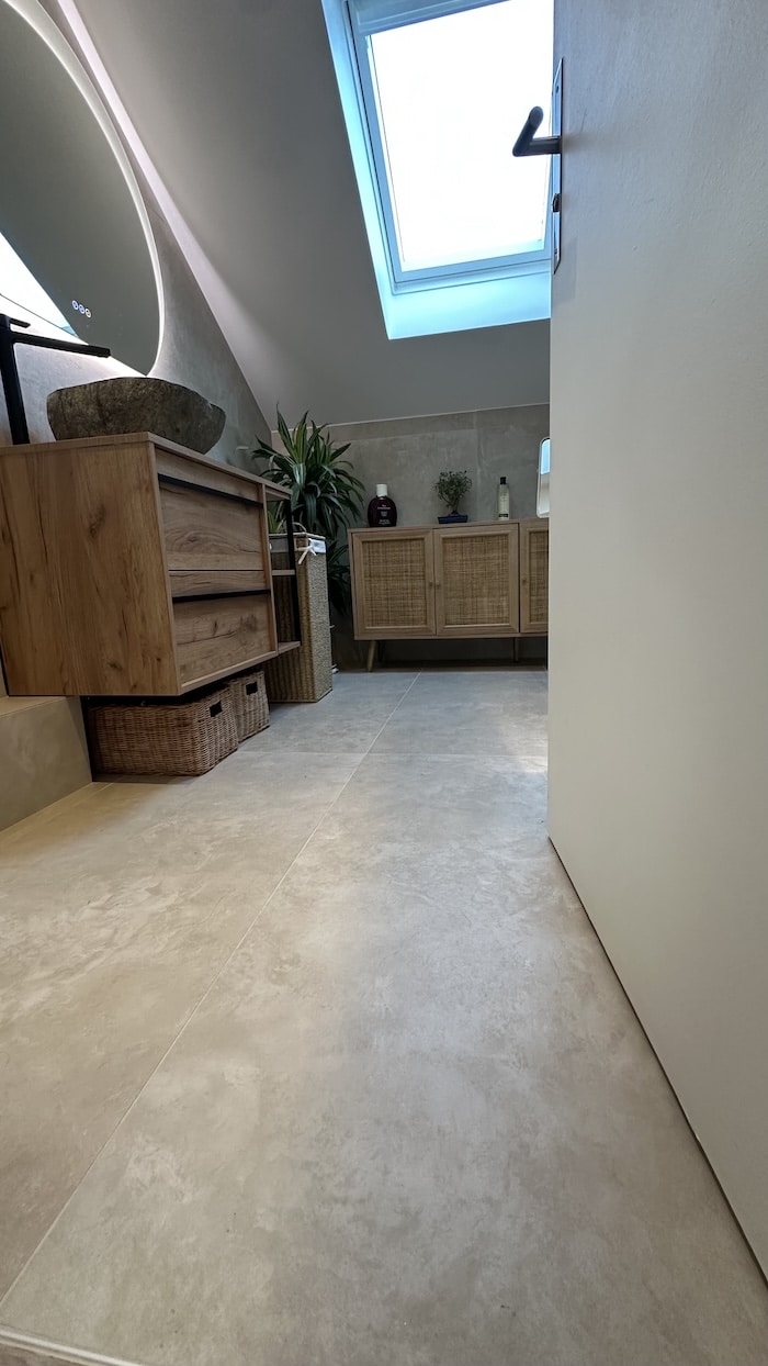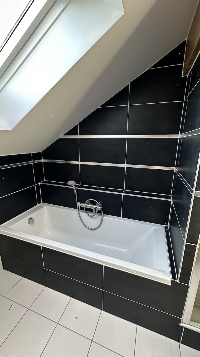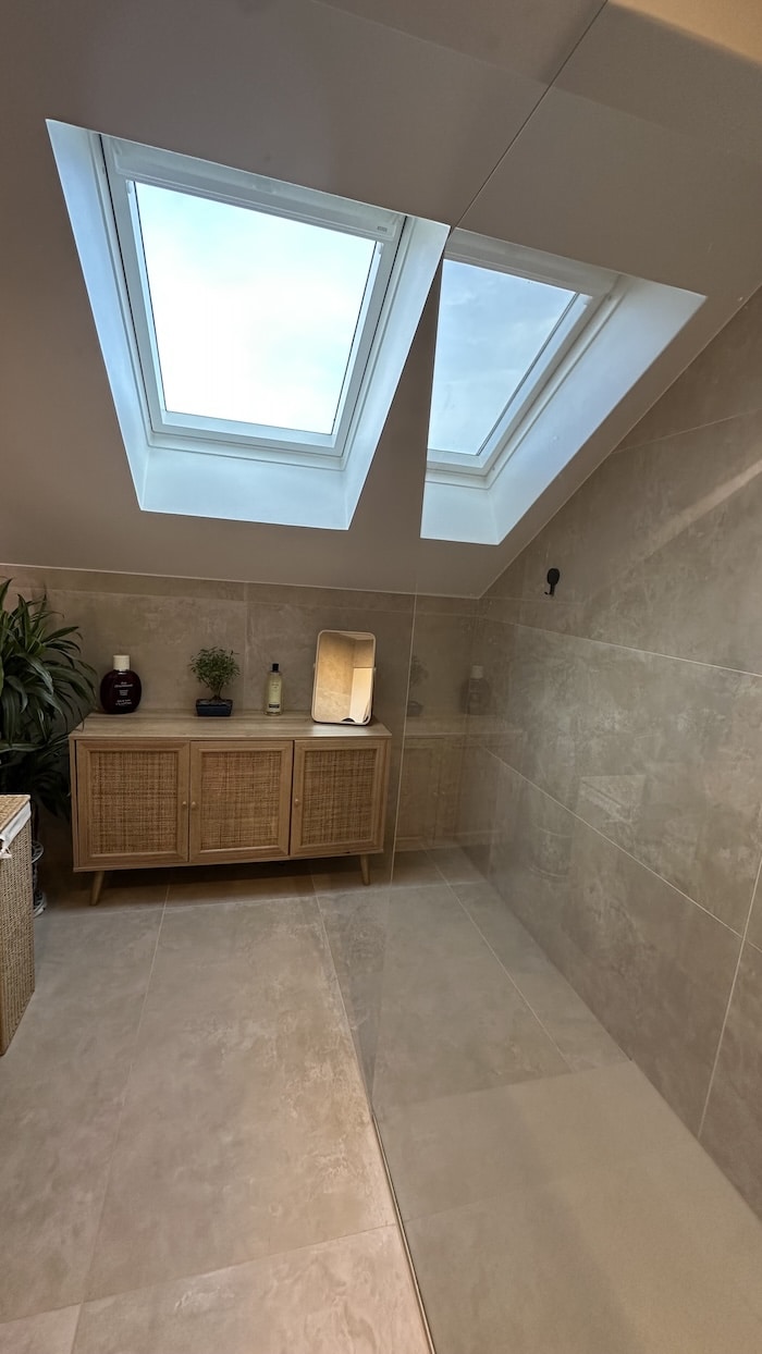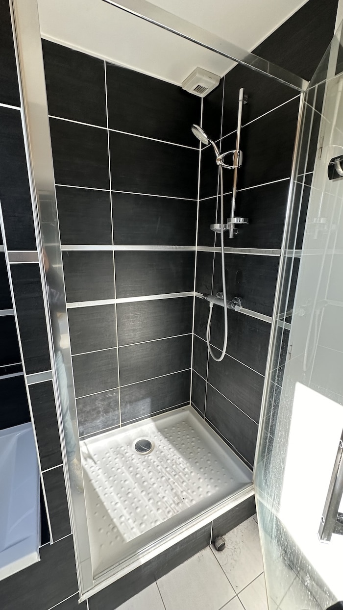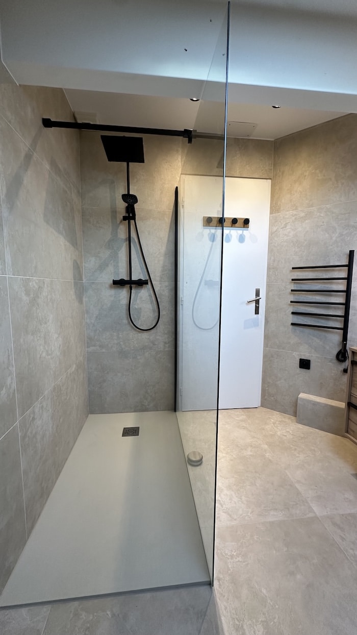 Ce chantier a débuté par la dépose des doublages existants trop endommagés, suivie d’un ragréage du sol afin d’obtenir une surface plane et stable. L’installation électrique a été complétée par l’ajout de prises, d’interrupteurs et de spots encastrés au plafond. Côté plomberie, les anciennes arrivées d’eau ont été supprimées et une étanchéité soignée a été réalisée avant la mise en place du receveur de douche. Le mobilier de salle de bains, la vitre et la colonne de douche ont ensuite été installés. Les tuyaux apparents ont été habillés par un coffret en carrelage, assurant une finition propre et homogène. Les travaux se sont conclus par une remise en peinture du plafond.