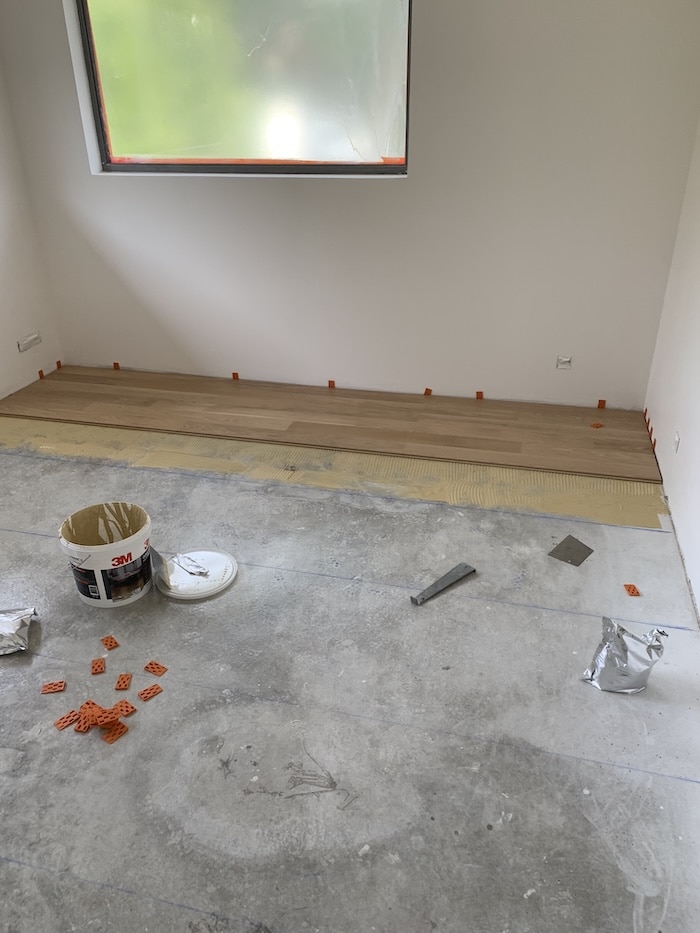 Nous évaluons d’abord l’état du support existant et son degré d’irrégularité pour déterminer l’épaisseur de réagréage nécessaire. Cette étape peut concerner des sols en béton dégradés, des anciennes chapes fissurées ou des supports ayant bougé avec le temps. Un sol bien préparé garantit une meilleure tenue du revêtement final et évite les problèmes ultérieurs comme les décollements ou les déformations.